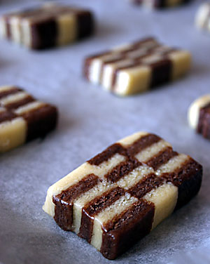 4. Hamurları dolaptan çıkarıp 2 parmak kalınlığında şeritler kesin. Yağlı kağıt üzerinde 2 vanilyalı şeriti ve 1 kakaolu şeriti birbirlerine yakın ama değmeyecek şekilde yanyana koyun. Kalan bir yumurtayı bir kasede çırpın ve fırça yardımıyla yerleştirdiğiniz şeritlerin üzerlerine ve yanlarına sürün. Şeritleri birbirlerine değmeleri için hafifçe itin. Üst kata 2 kakaolu ve bir vanilyalı şerit yerleştirip onlara da yumurta sürün. Böylece 6 kat yapın. (Uzun şeritlerle uğraşmak zor olduğu için ben uzun şeritleri keserek yaptım)
