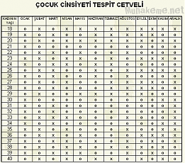 ( KIZ : O ERKEK : X ) NOT: Kadının yaşı doğru olarak belirlenir ve hangi ayda hamile kaldığına bakılır. Yaş ve hamile kalınan ayın kesiştiği kutucuk bulunur ve sağa doğru 9 kutucuk sayılır. 9. kutucuktaki işaret (o) ise kız, (x) ise erkektir.