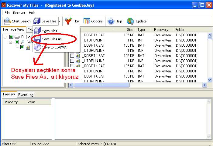 Burdaki listeden kurtarmak istediğimiz dosya/dosyaların sol tarafındaki kutucuğu işaretliyoruz ve araç çubuğunda bulunan Save Files in yanındaki küçük ok işaretine tıklıyoruz
